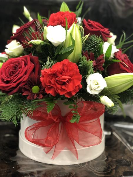A beautiful festive hatbox of flowers and foliages. You can choose if you would like to add gold or silver accessories to give that extra festive sparkle.