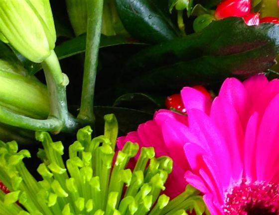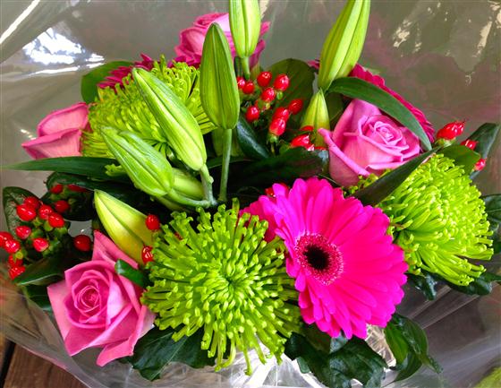 A contemporary selection of hot pink gerberas, aqua roses, scented lilies and lime shamrock blooms. Perfect for that special celebration of just because...