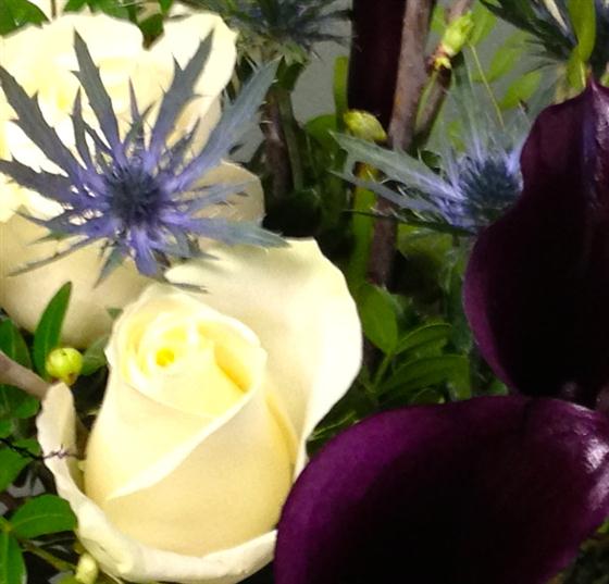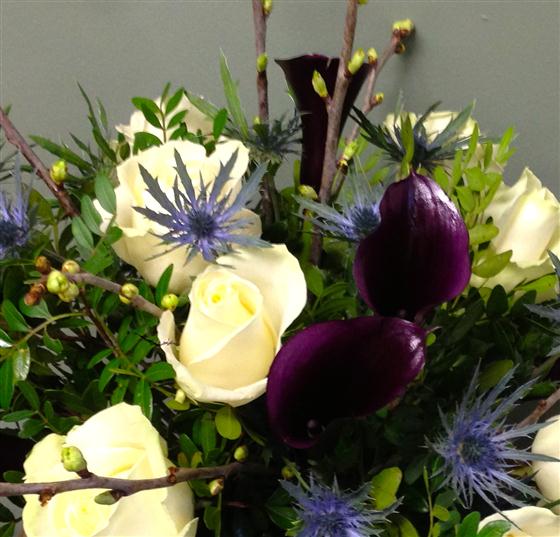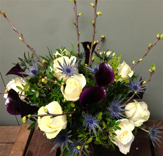 For something a little bit different choose this stylish, modern collection of calla lilies, roses and thistles.