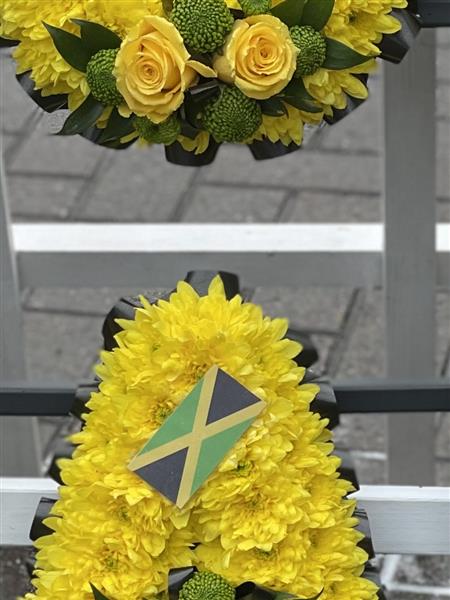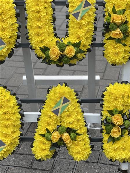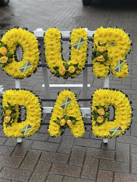 A stunning show stopper with this "our Dad" floral tribute made in Jamaican colours standing proudly on a wooden frame.