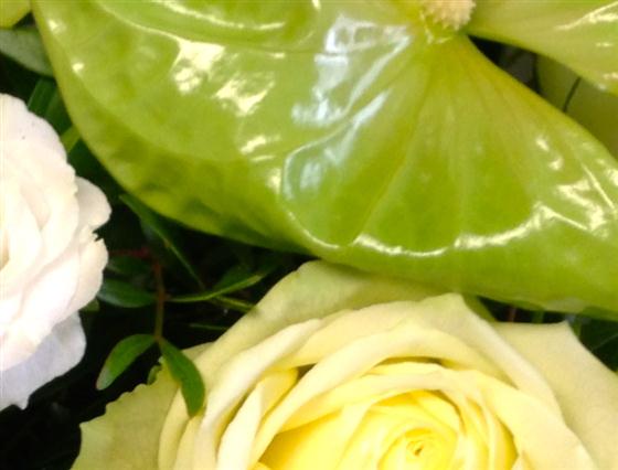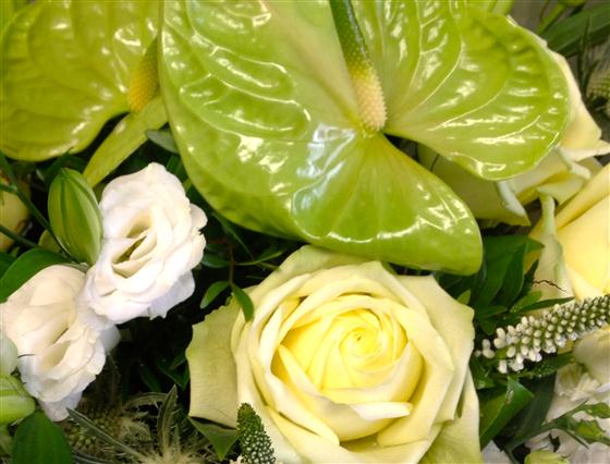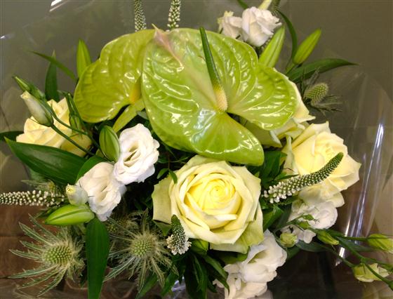 A zesty collection of white and lime blooms including anthuriums, roses, veronica and lisiantus with scented oriental lilies.