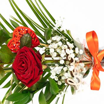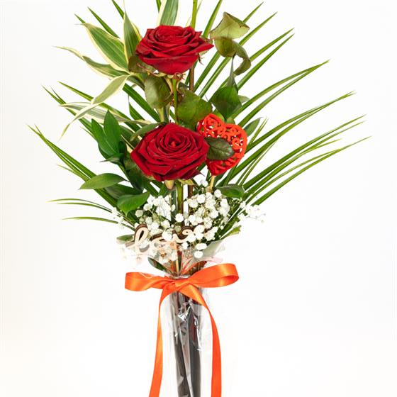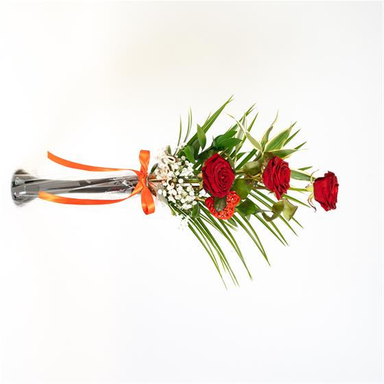 Trio of Premium red roses with mixed foliage. Delivered in a vase and presentation bag. please note that bag and vase may differ to one shown but would be of the same high grade presentation.